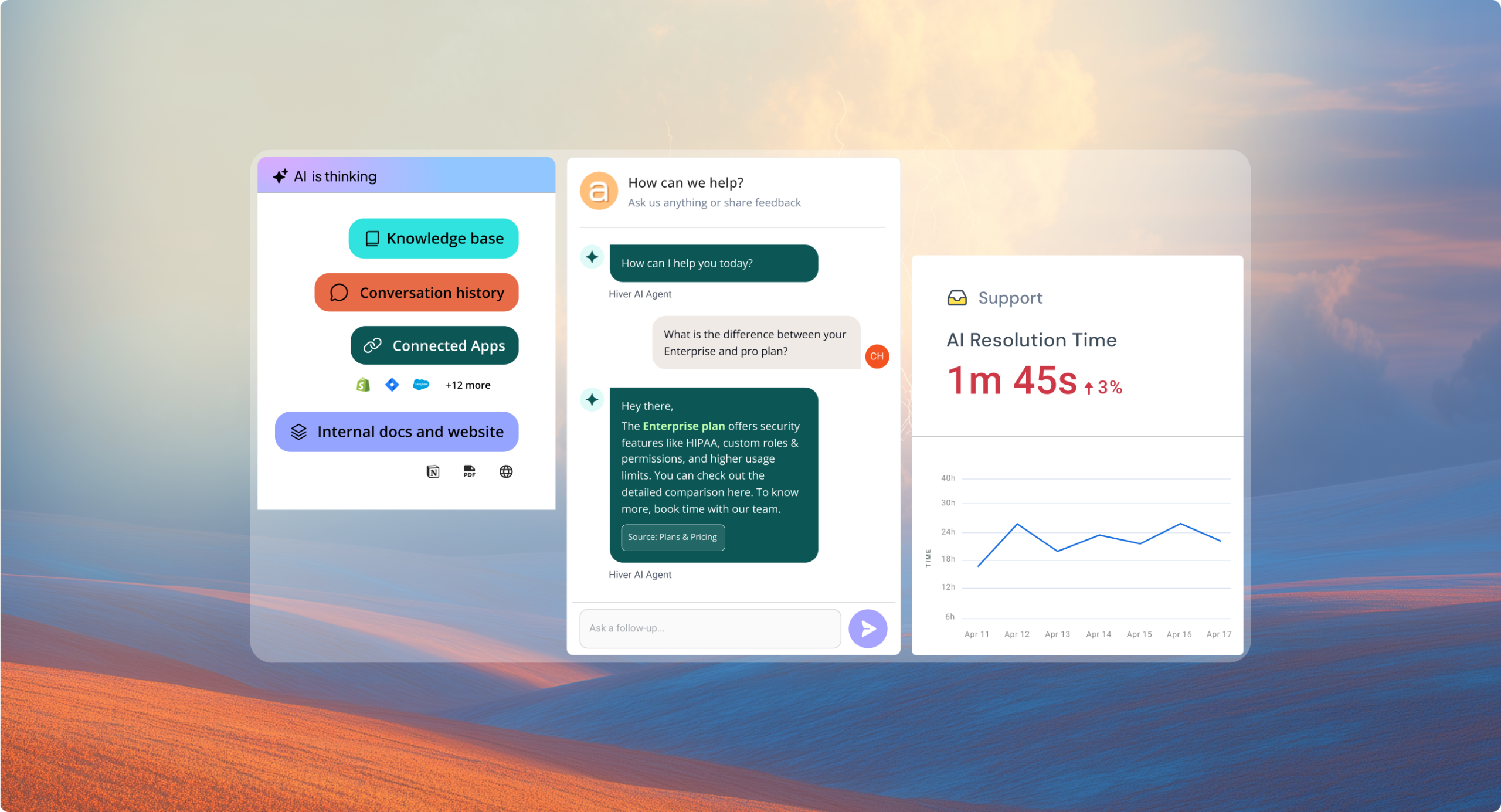 Most helpdesks stop at simple deflection. Hiver AI and workflows are built for the hardest inquiries—define your rules, tell it exactly when to step in, and it resolves requests across every channel.