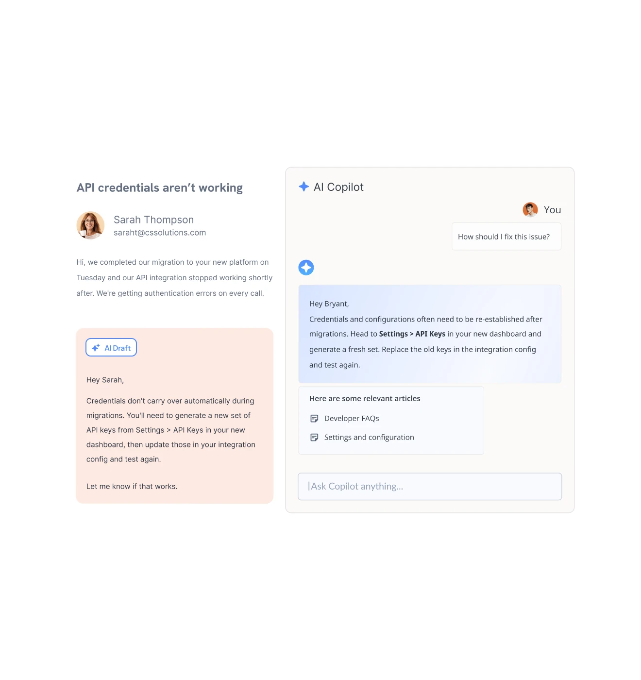 Your team needs AI that helps with more than just basic FAQs. AI Copilot drafts replies for even the toughest support requests, grounded in everything your team knows — past conversations, account history, and internal docs.