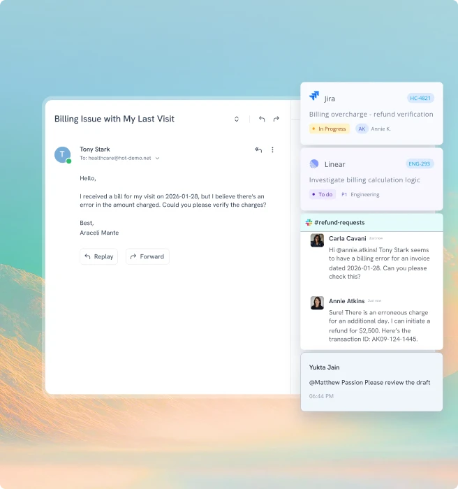 Manage escalations and handoffs with shared visibility and context. Whether it’s engineering in Jira, finance in NetSuite, or product in Linear — Hiver syncs updates in real time so nothing gets lost.