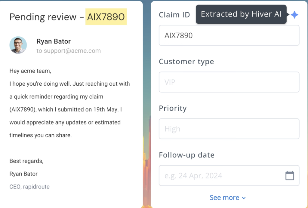 For example, a customer emails: “Hi, my order #45821 hasn’t arrived. It was supposed to be delivered on Feb 10.” AI Extract automatically pulls out the order ID and delivery date from the email, adds them to the ticket, and makes that information instantly visible to the agent, so they don’t have to read through the message or copy-paste details before taking action.