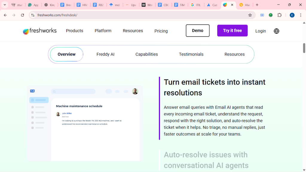 FreshdeskMulti-channel SMB supportFreddy AI, chatbots, SLA trackingFrom $15/agent/monthShopify, HubSpot, Salesforce, Jira