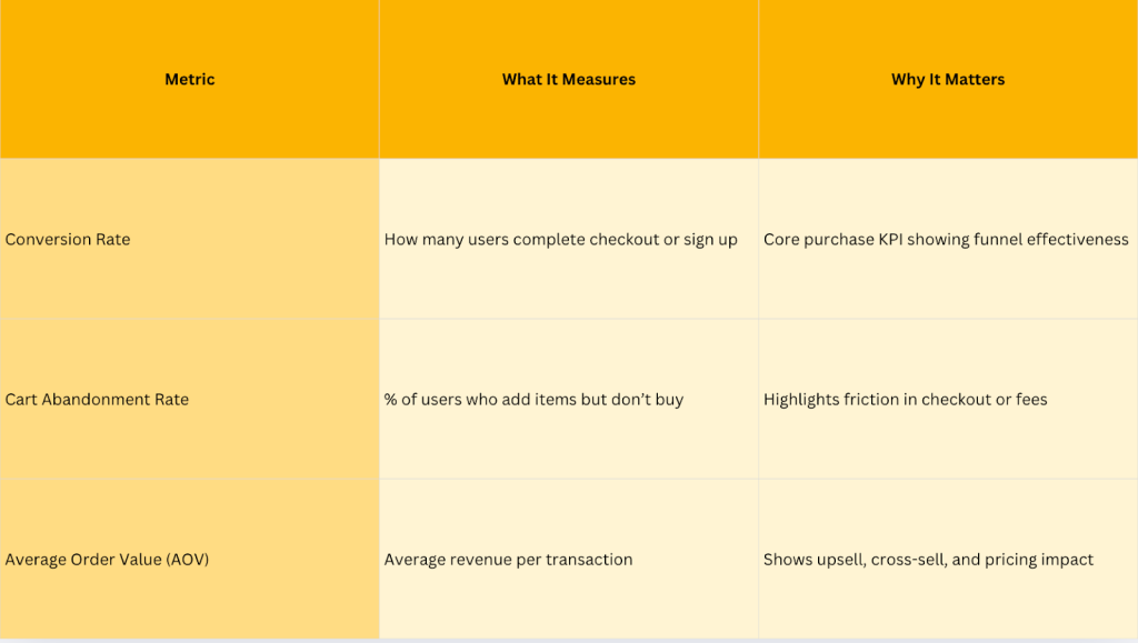 - Cart abandonment rate: Indicates friction points like hidden fees or long forms.