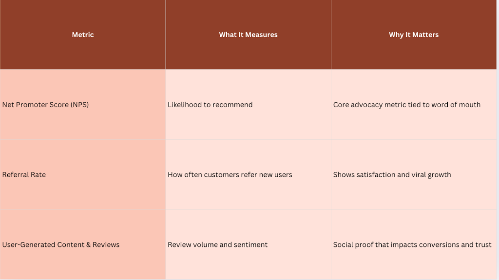 - Net Promoter Score (NPS): Measures willingness to recommend your brand.