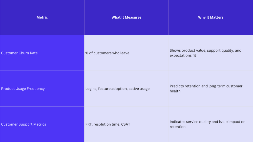 - Customer support metrics: First response time, resolution time, and CSAT scores.