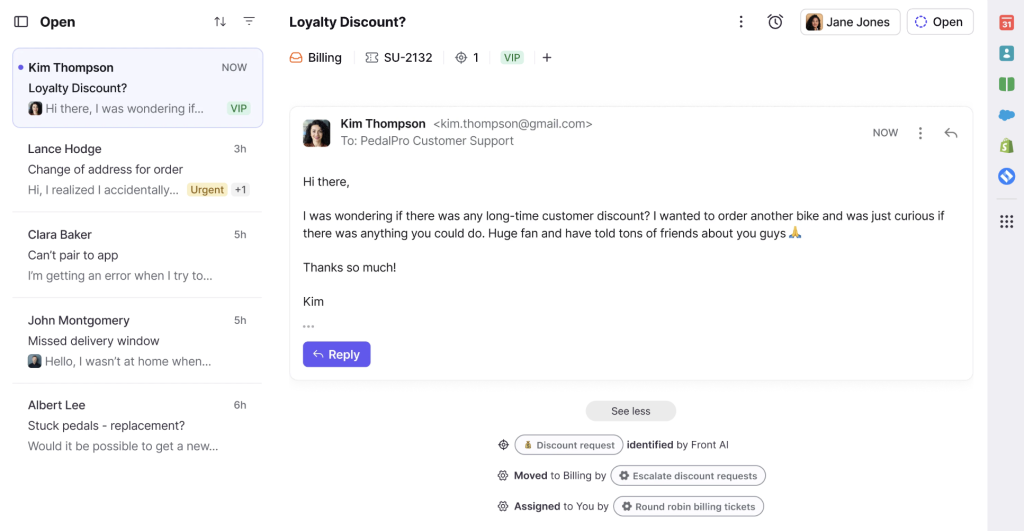 Front offers a collaborative inbox to manage customer emails – and its interface is very similar to that of your regular inbox. Teams using Front – especially customer support, finance, and IT – can assign emails as tasks, collaborate on responses, and automate workflows with ease.