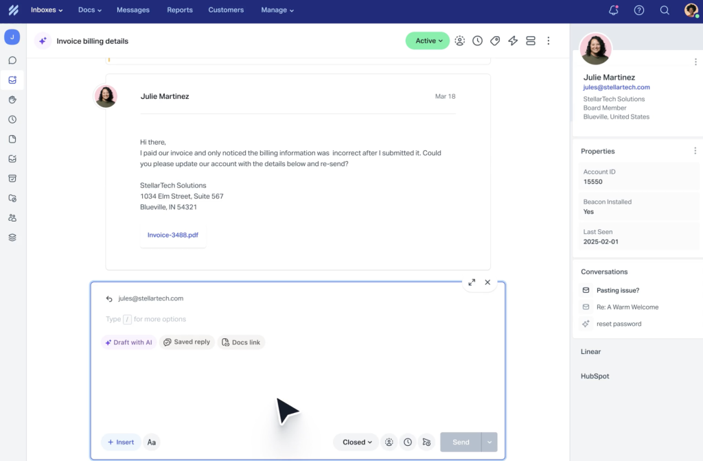 • Team Collaboration: Use internal notes and shared drafts to ask a colleague for help or getting a fresh pair of eyes before sending out the response.