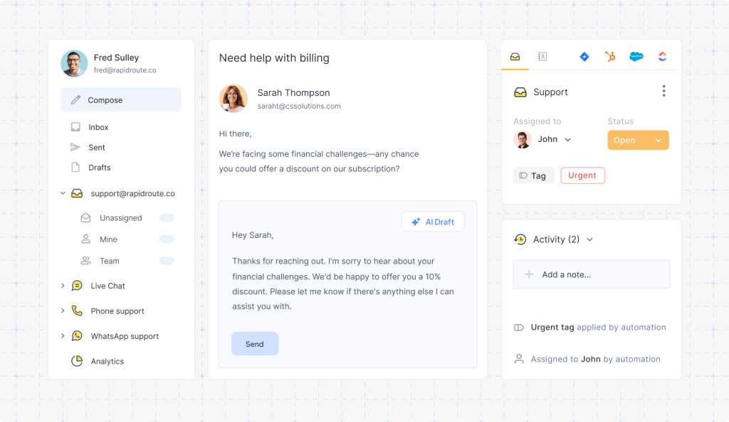 - Collaborative inbox: Work together in real time with shared drafts, comments, and task assignments – ensuring every customer query gets the right response.