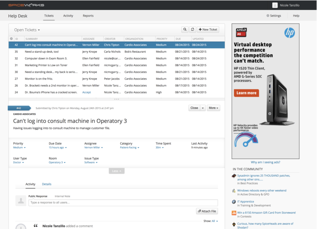 | Spiceworks | Ticket automation, knowledge base, reporting | Forever free (ad-free at $5/user/mo) | 4.3⭐ |
