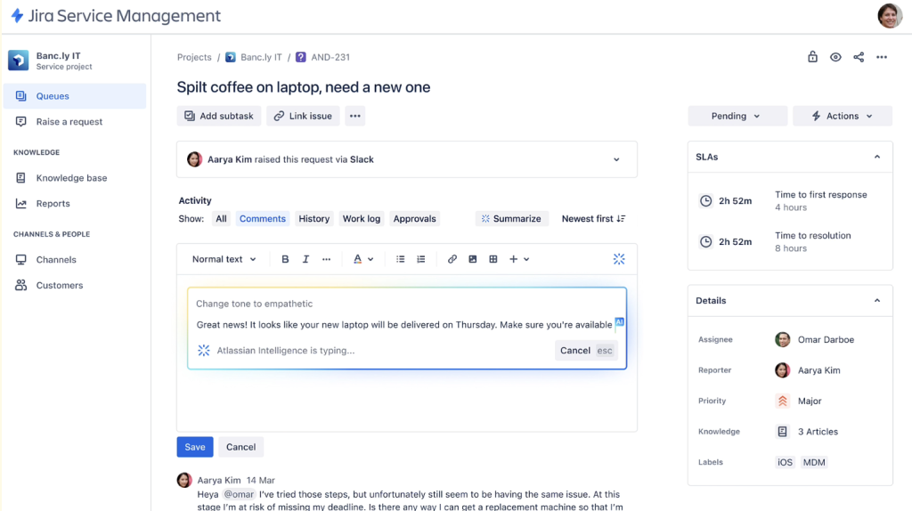 - Deep Jira integrations: Connect with Jira Software and Confluence to align IT, DevOps, and support. Developers see customer-reported bugs directly, while agents can link tickets to projects without switching tools.