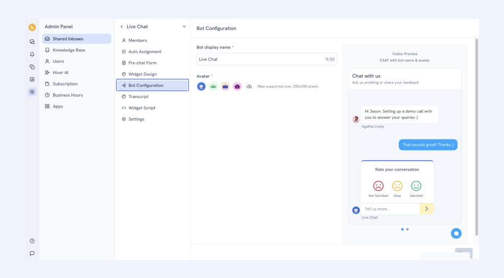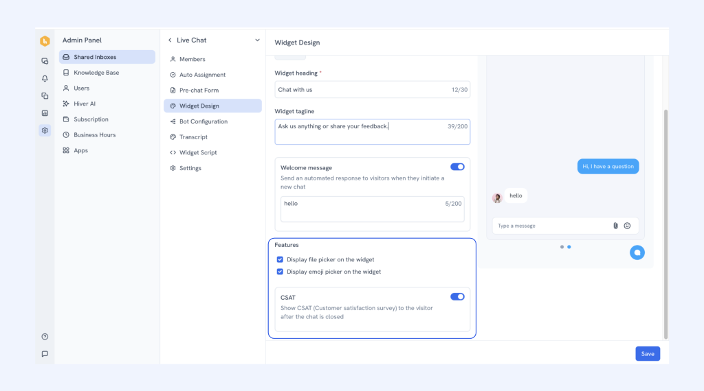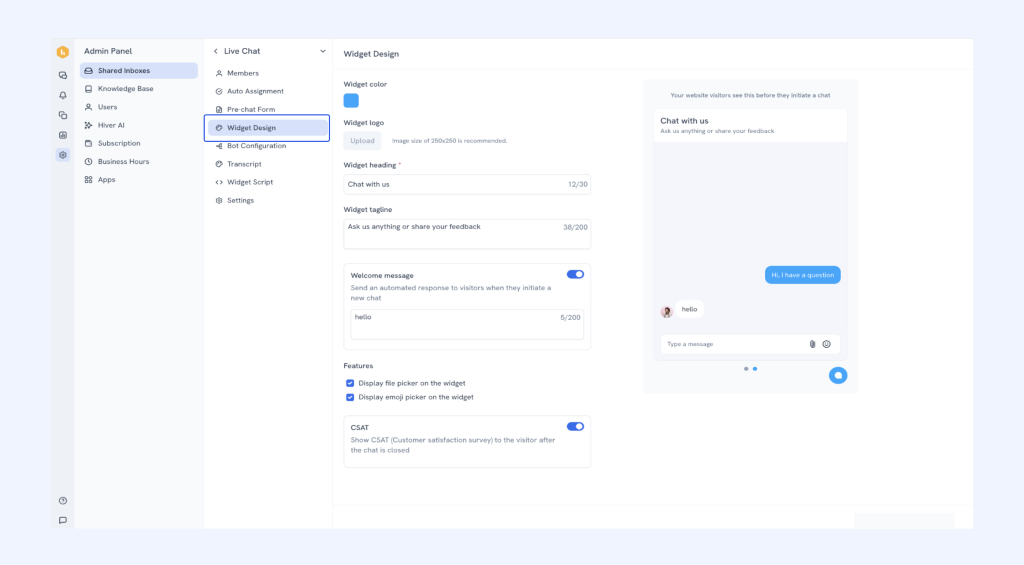 - Once the chat widget is configured, the admin can later come to the widget design screen to set up attachments, emoji picker and CSAT.