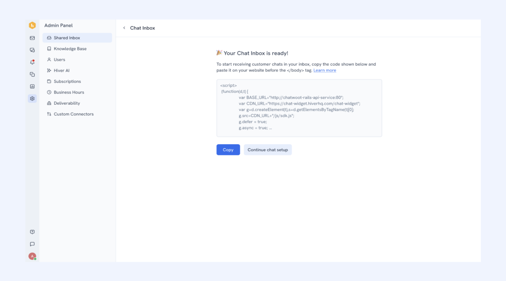Since I work at Hiver, the best example I can walk you through is how to set up Hiver’s live chat widget. It’s one of the easiest implementations I’ve come across, and takes less than five minutes.