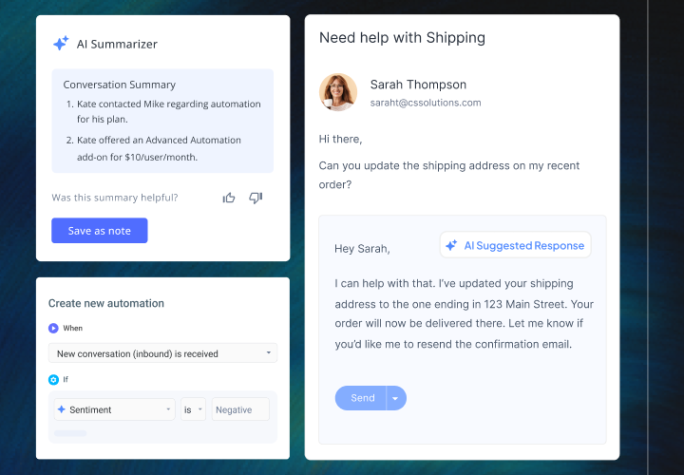 - AI Summarizer condenses long exchanges between the customer and the support team into concise notes, helping agents instantly grasp the context before replying
