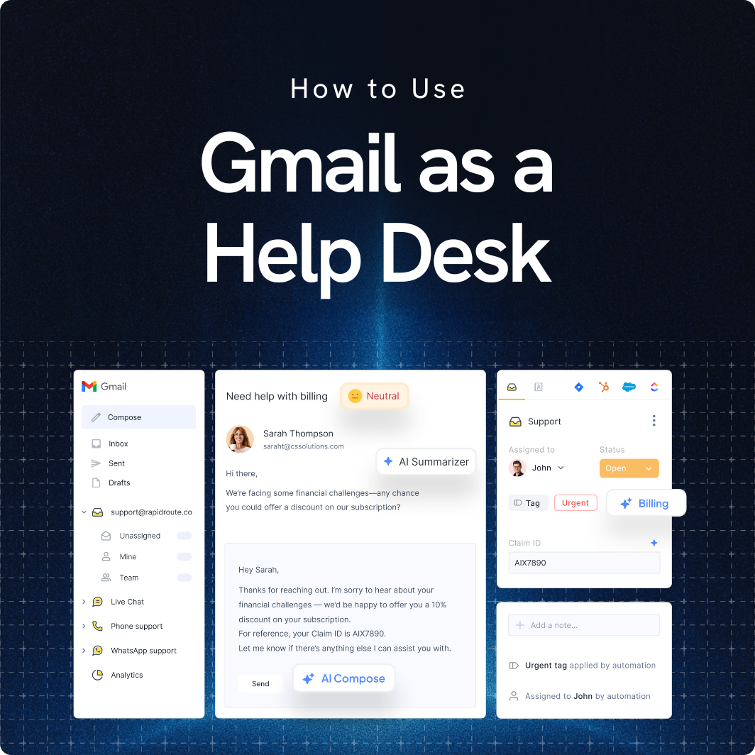 Gmail, on its own, isn’t built to function as a help desk: it doesn’t give you clear ownership of conversations, track SLAs, or surface response-time data. For growing support teams, this can mean missed messages, slower resolutions, and a lack of accountability.