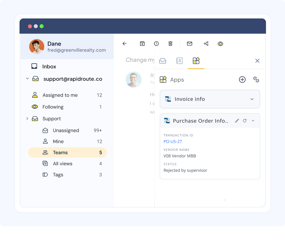 Surface key NetSuite records such as invoice info, all purchase orders, all sales orders, vendor details, customer details, contact details, and custom fields as cards right next to the conversation, so your team always has the full picture when resolving or replying to a query.