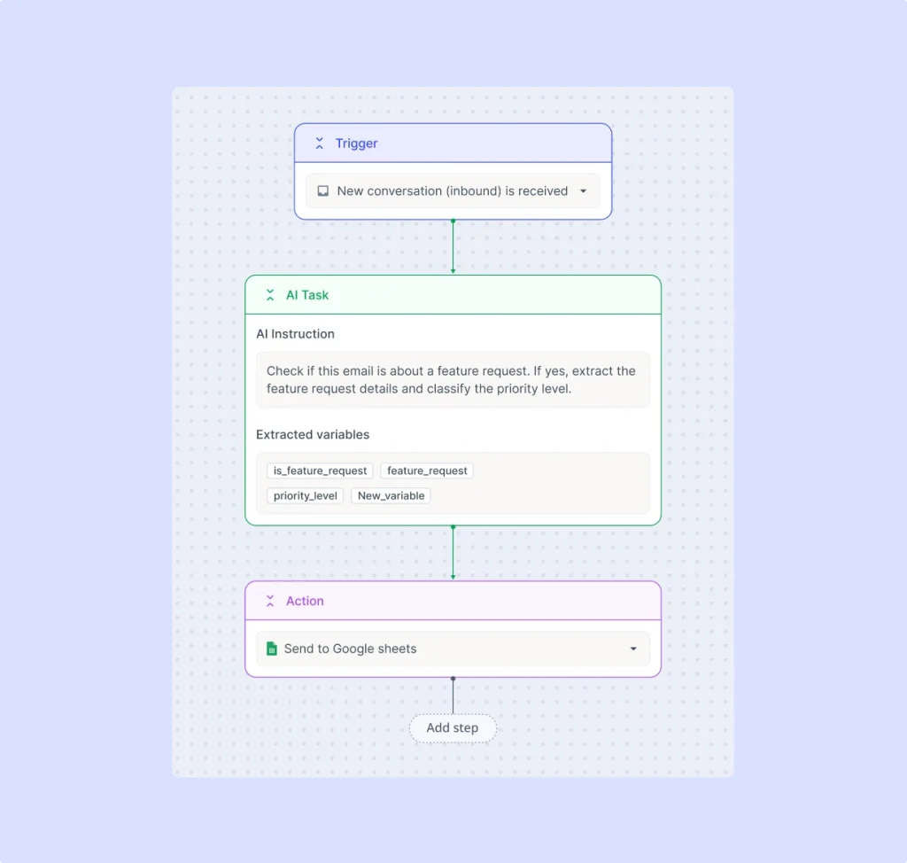Teams use a visual, multi-step builder that combines rules with AI steps to automate even the most complex scenarios with ease. Automations support “if-else” scenarios and changes in conversations, accounts, and AI signals – without specialist effort.
